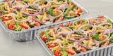 Serves 12-16. Grilled chicken with fresh greens, red onions, green peppers, black olives and tomatoes. Sprinkled with mozzarella, cheddar and Pecorino Romano cheeses.