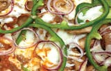 Traditional red pizza sauce and seasoned garlic sauce baked with seasoned steak, fresh mushrooms, red onions, crisp green peppers, Wisconsin mozzarella cheese and finished with Pecorino Romano cheese